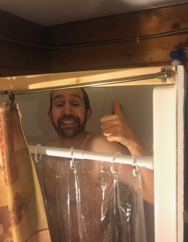 I think people are still getting over the fact the average person living in a traditional household (reminder: complete with a toilet, dishwasher, washing machine, etc) uses 80-100 gallons of water per day. But now it’s time to address the another piece of dry cabin living: showers. Sit down, people, I know you will gasp. …