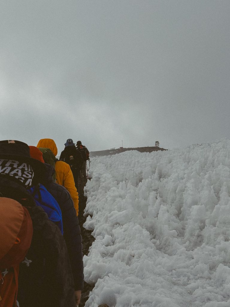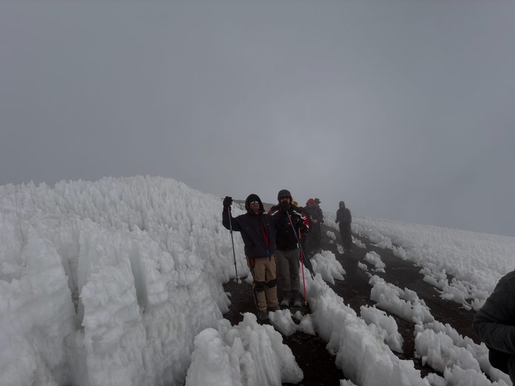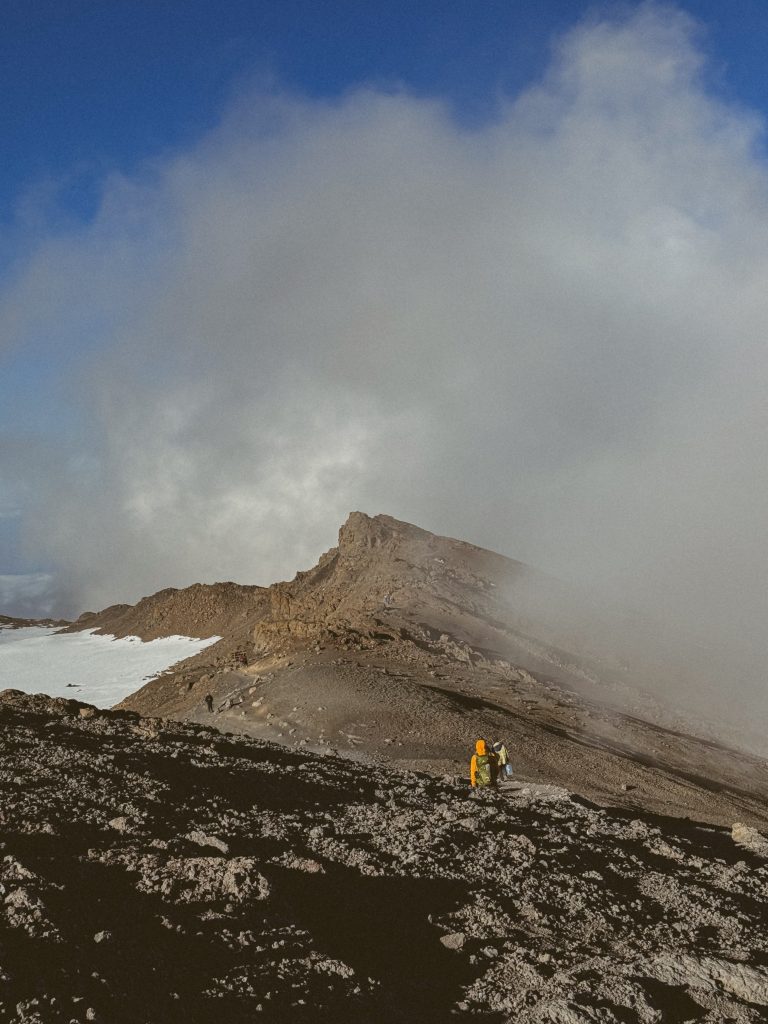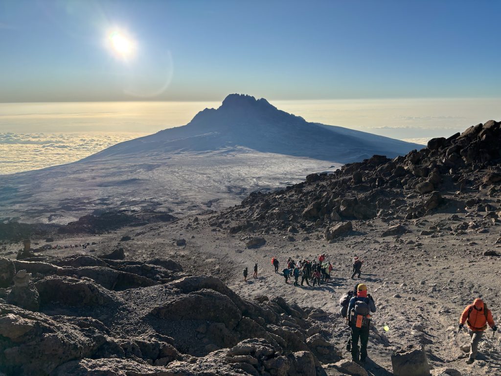 There are several “false” summits along the way, and they are great turnaround options for those who may not get all the way to the top. We reached one of those—Gillman’s Point at 18,885 feet—which looks down into the volcanic crater. You could see the true summit of Uhuru Peak (19,341 ft) from there, but it is always further than it seems. For me and my small group of team members, it was 2pm at Gillman’s Point, and getting close to my personal turnaround time. If we continued to the summit, we would be hiking down in the dark. Two people made the decision to turn around here. However, the rest of the group was in good spirits, and I could tell they still had the energy. As long as we walked like slow astronauts and breathed properly, I knew I could lead this team safely to the top. A group of 9 of us reached the summit around 4pm! We spent 20 minutes taking pictures, then headed back down.