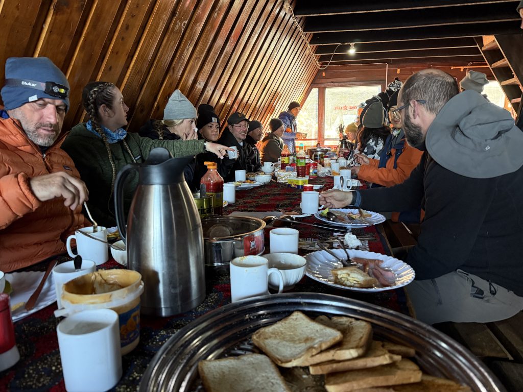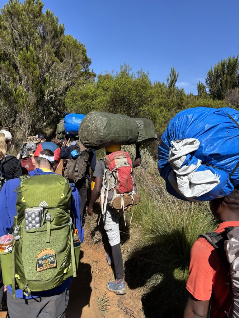 Day 2 was a 7-mile climb from Mandara Camp at 8,858 feet to Horombo Camp at 12,205ft. We were up at 6am, but did not leave until after 8am. I was concerned about our departure times, since my previous climbing experiences taught me to leave before sunrise to beat any heat of the day and avoid climbing at night. However, the guiding company didn’t seem concerned. This proved to be the hardest day for all of us. Some people could not help out on the chair anymore because of exhaustion, especially given the fact we were gaining elevation and altitude was starting to mess with people. Our teams of 3 merged into whoever could help, just speak up and hop on chair duty. I was worried not only for Jeff, but for all those near the wheelchair in the case they could get caught under it—even snapping an ankle—or knocking someone down. For me personally, I felt like I was on chair duty much more than I expected, and I pushed myself to my exhaustion limit. Another side note, there were definitely too many cooks in the kitchen, as you could expect in a large group. Lots of opinions on how to correctly maneuver the wheelchair, etc. Around 5pm, we decided to send half of our group—those who were most exhausted and could not help out anymore—ahead to the hut. We also decided we needed help with the wheelchair from the guiding company. Again, this was never the intention. But it was clear we needed it, and I was glad our leaders realized help was necessary. The porters jumped right on the chair and worked their asses off the rest of the day. They spoke Swahili to each other, and moved so efficiently though the terrain that they were so familiar with. It ended up being a 12-hour day, and we were all exhausted and spent. We had a strange meal of rice and some type of meat and everyone crashed hard. This evening we had a bunkroom above the dining room that slept 20 of us.