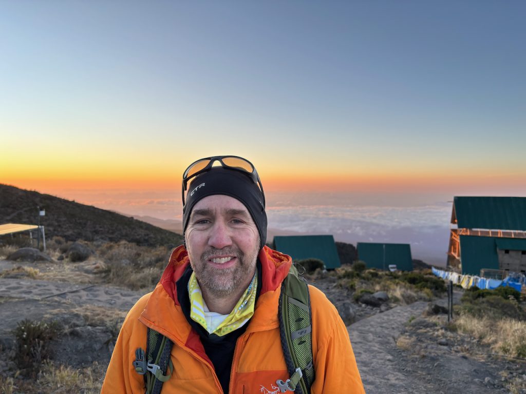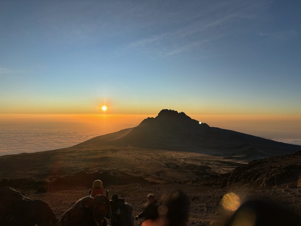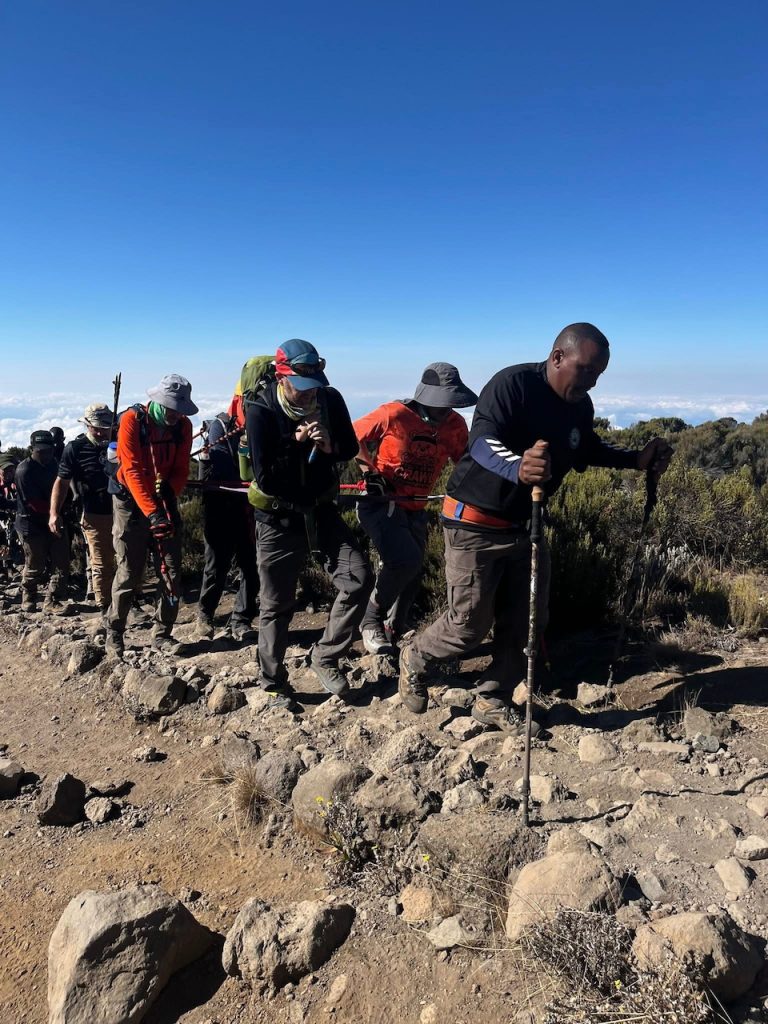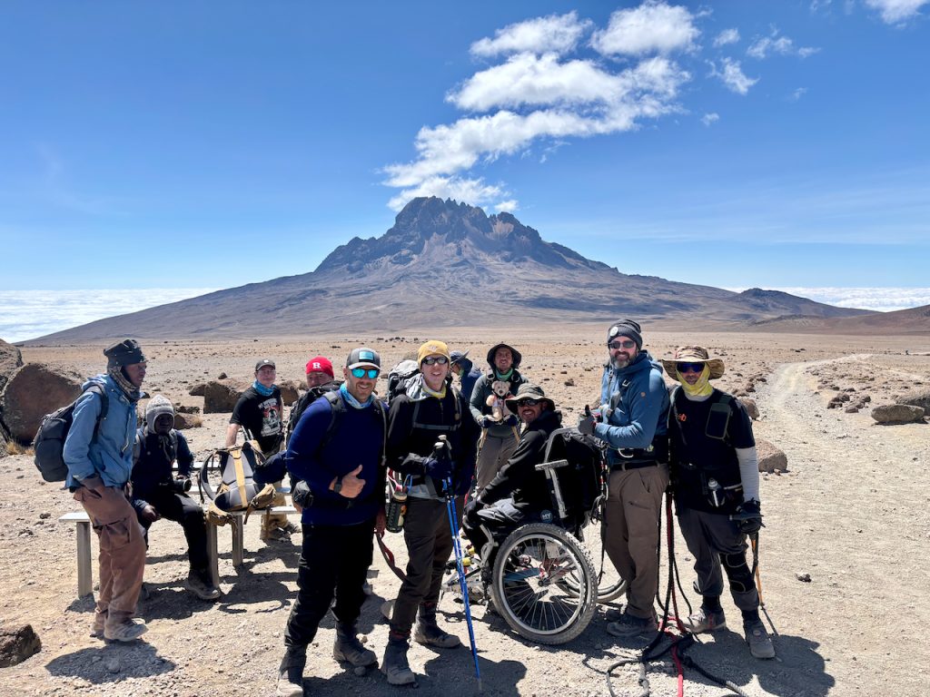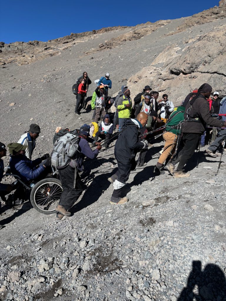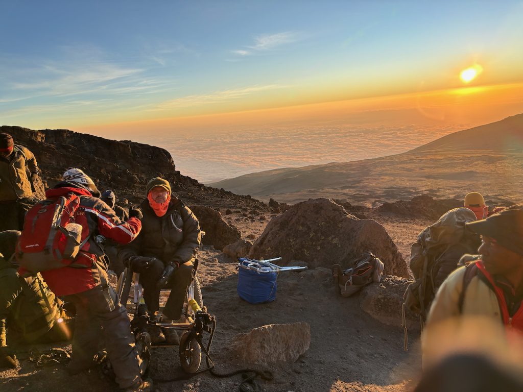Day 4 was summit day, of course the hardest day. It would be 8-miles roundtrip, 4 miles with 4,ooo feet of elevation gain from Kibo Camp to Uhuru Peak (19,341 ft), then 4 miles back down to Kibo Camp 15,430ft. I immediately had a few concerns. Our wakeup call was at 3am, then we started the climb “late” (in my opinion) at 5am. I was very surprised the African guides did not conduct a safety meeting, didn’t talk about turnaround times when to stop the climb to avoid dangerous situations like climbing down in the dark, and what the signs of altitude sickness were. The guides also never taught the group about how to climb at altitude. Jeff did make it a point to say that if he could not summit he wanted as many of us that could to make the attempt. I had brought this up a few times during our monthly Zoom meetings. As the only person who had been on long climbing and hiking expeditions, I stressed that it would extremely unlikely that we would all make the summit, and even more unlikely that we would all reach it together. I believe most of our group assumed this would be a walk in the woods, and it would be one happy group at the summit for a massive group picture. So when we departed at 5am for summit day without real-time expectations discussed, about half the group members left and sort of did their own thing to get to the summit. I strapped into the chair for shift 1—again with the mixed help of the porters and team members. There was no real trail but a path in the dusty scree field that zig zagged up the mountain. We were moving slower than a snail, and pure exhaustion was rampant. The wheelchair was also breaking down—the two front tires shredded off, and we could only rely on the back tires. I switched on and off the chair for hours, sometimes on for mere minutes, other times trying to push the 20-30 minute mark. We watched the sunrise over the clouds and the smaller peaks below.