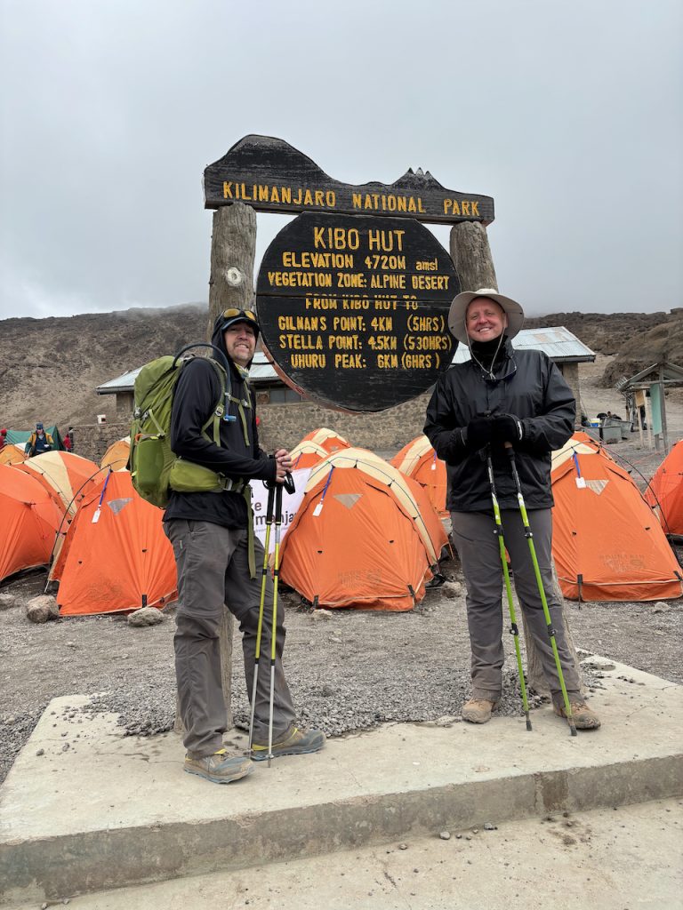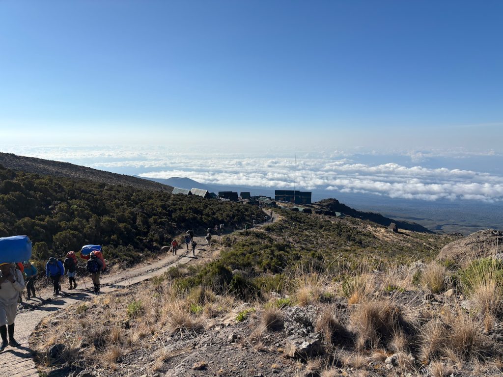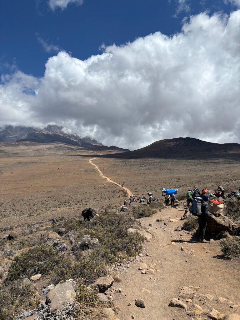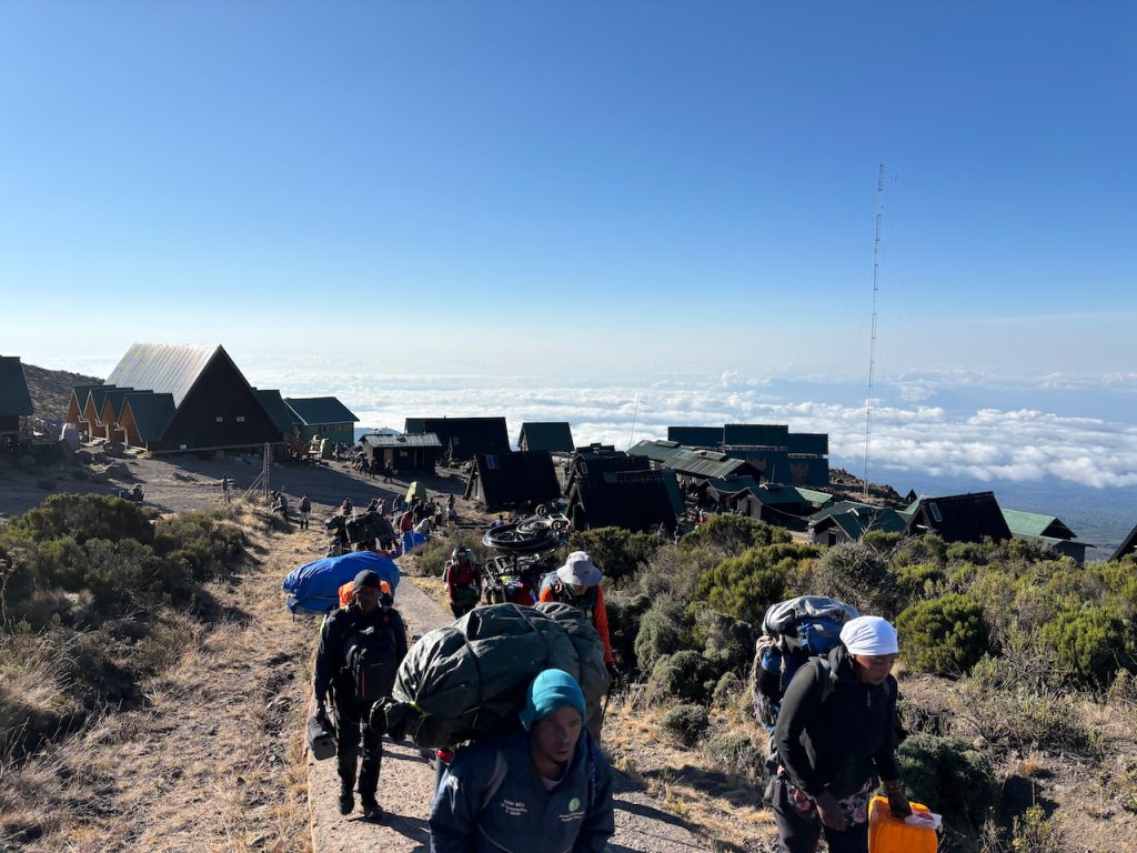 As expected in a 20-person bunk room, it was a rough night of sleep, with maybe 3 hours of actual rest. We left at 8am from Horombo Camp, and had a 6-mile trek to Kibo Camp at 15,430ft. The trail was wide for easy chair maneuvering, and even had lots of flat sections. Being out of the rainforest meant we were above the clouds and exposed, but the weather was great. We continued to work with the porters for help with the chair—mixing team members in with porters. It was very efficient and we made great time. We even beat the lunch porter team to the lunch spot by 20 minutes! We rolled into Kibo Camp at 2:30pm. Even though it was an “early” and “easier” day, I could see the exhaustion splayed across many team members’ faces. At 15,430 feet, this was the highest any had been, and altitude is no joke. We all settled in for some rest after a spaghetti dinner.
